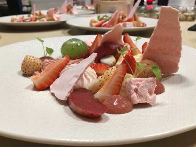 Tailler des morceaux de roulé à la vanille, couper les fraises en 4, faire des points avec la gelée de rhubarbe, casser des bouts de plaque de meringue, disposer le tout le plus harmonieusement possible car la première dégustation se fait avec les yeux.