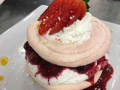 • Pour la finition, sur des assiettes individuelles, déposez un disque de meringue, recouvrez de la crème mascarpone et de fruits rouges, mettez un second disque, puis recouvrez de la crème mascarpone. Saupoudrer de chocolat blanc et une fraise pour décoration.