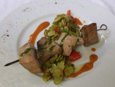 Le restaurant "Alios" nous fait découvrir ici sa recette de brochette de thon rouge en duo de fèves et poivrons au jus de tomates.